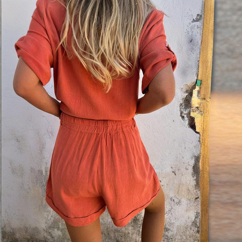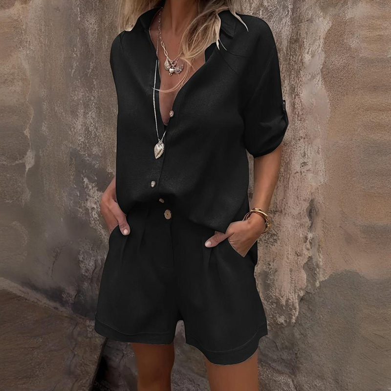 Women’s Solid Color Lapel Short Sleeve Shorts Set – Button-Up Casual Two-Piece Outfit With Pocketed Shorts Summer Minimalist Outfit